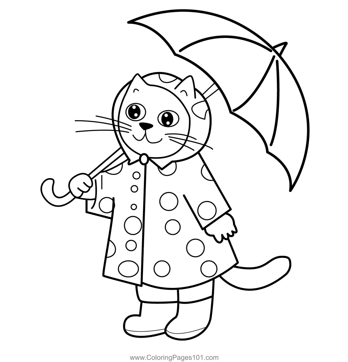Cute Cat in Raincoat Umbrella Coloring Page