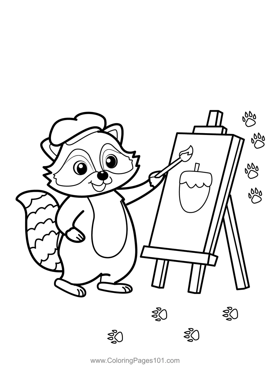 Artist Raccoon Paints An Acorn Coloring Page