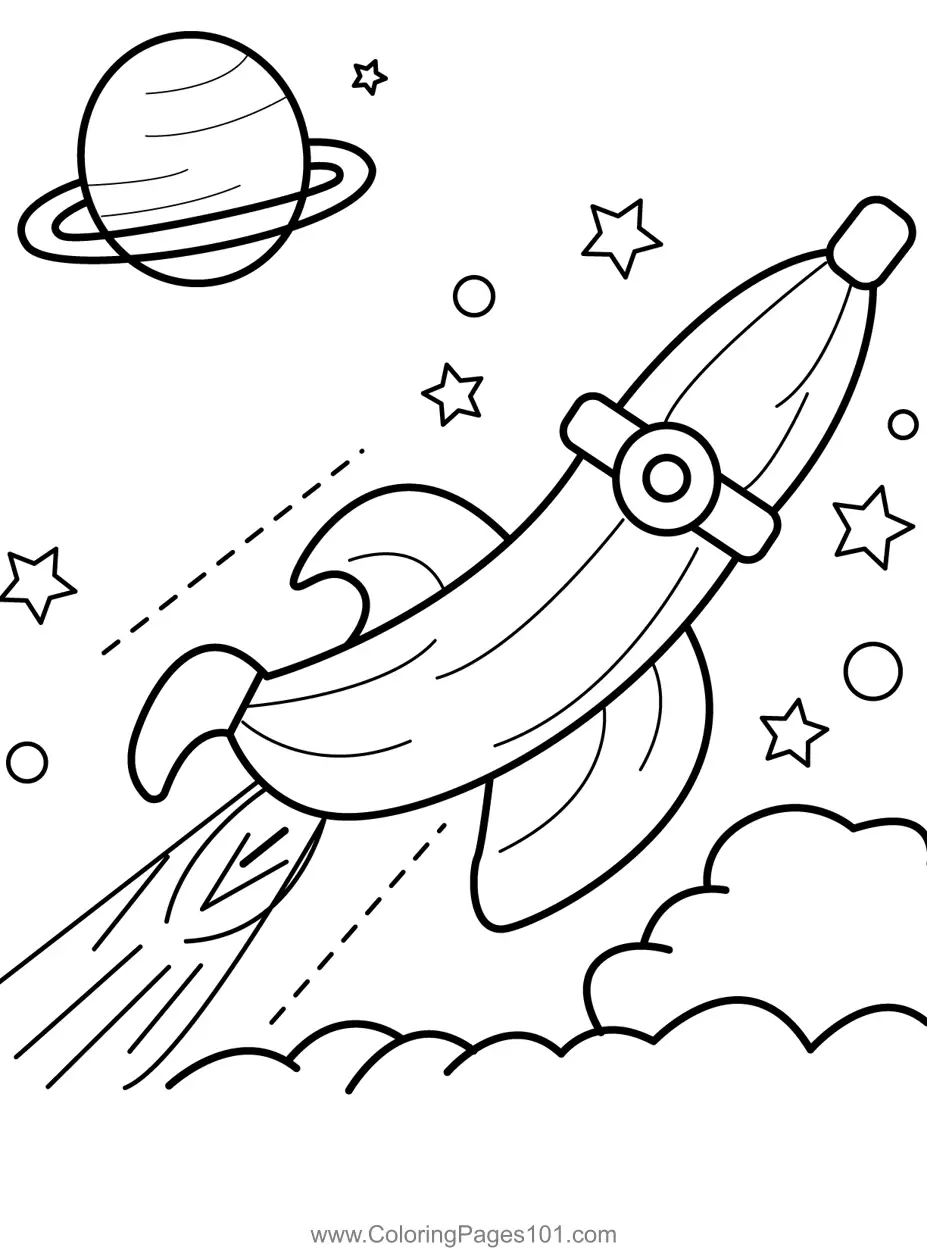 Banana Spaceship Explores Planets Coloring Page